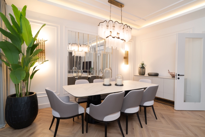 Yemek alanında ise modern şıklığın izleri hakim. Dairesel aydınlatmalar, mermer masa ve geniş oturma alanları ile birleşerek lüks bir yemek deneyimi sunuyor. Aynalı duvar panelleri ve minimal detaylarla zenginleştirilen yemek odası, sade olduğu kadar göz alıcı bir görünüme sahip. Işık oyunlarıyla mekânın derinliği artırılmış, böylece alana modern bir boyut kazandırılmıştır.